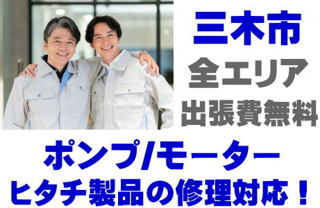 三木市でHITACH製品(井戸ポンプ、水中ポンプ)の故障修理はヒタチ取り扱い店の当店が即日対応いたします!